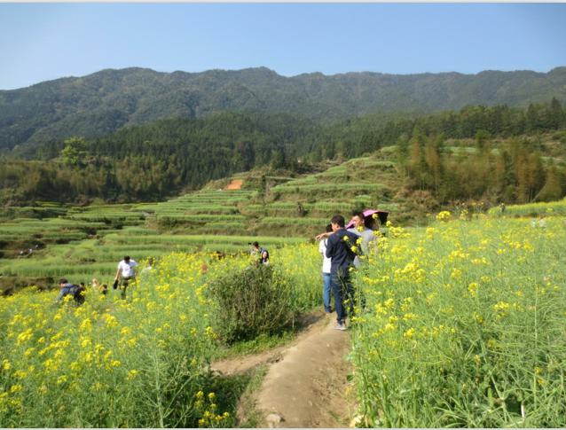 第二天上午我們乘車(chē)來(lái)到江西婺源江嶺,婺源歸來(lái)不看村,江嶺歸來(lái)不看花。江嶺,是國內四大油菜花海之一,江嶺自然是婺源觀(guān)賞油菜花的首選之地。萬(wàn)畝油菜花海在漫山遍野的梯田間肆意綻放。漫步于高低蜿蜒的觀(guān)景棧道,如同來(lái)到一片花的海洋。黃燦燦的花陣隨風(fēng)搖擺,就像一層層翻涌的波浪。在綿延起伏金黃花海之中,形成清新淳美的鄉村田園風(fēng)光,一派生趣盎然。