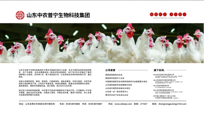 隨著(zhù)政府對動(dòng)物源性食品安全問(wèn)題的極大關(guān)注以及民眾對食品安全重要性認識的不斷提高,中獸醫藥必將在畜禽綠色健康養殖中發(fā)揮出更大的作用,為此,作為以致力于動(dòng)物健康與食品安全為發(fā)展宗旨的中農普寧生物科技集團,通過(guò)中獸醫專(zhuān)家的潛心研發(fā)經(jīng)過(guò)多年臨床實(shí)踐,結合國內肉雞養殖特點(diǎn),隆重推出了安爾康、安若素、倍爾爽等中藥產(chǎn)品,為養殖業(yè)保駕護航。